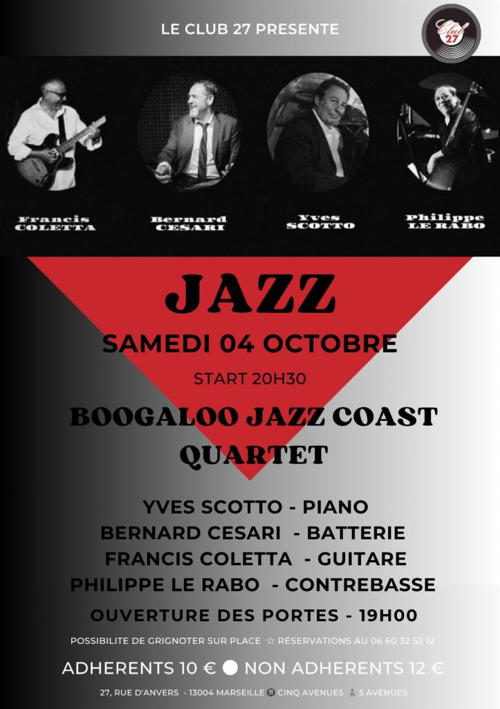 JAZZ – Boogaloo Jazz Coast Quartet avec Yves SCOTTO (piano), Bernard CESARI (batterie), Francis COLETTA (guitare) et Philippe LE RABO (contrebasse)
